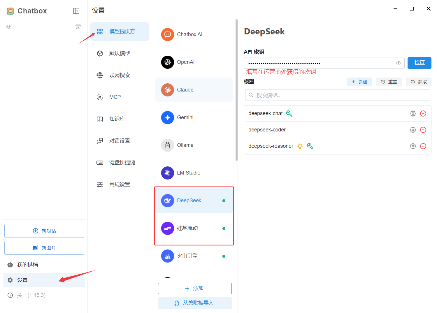 - 打开安装好的ChatBox,点击设置,选择DeepSeek,在右侧API密钥中填写上一步获取的API Key